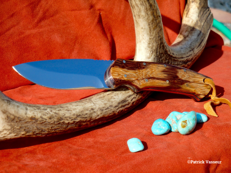 Couteau trappeur avec une lame en XC75, brute de forge. Le manche est en bois semi-précieux avec une incrustation d’étain.